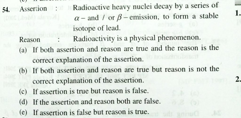 Assertion : Radioactive heavy nuclie decay by a series of alpha – and / or bita – emission , to form a stable isotope of lead. Reason : Radioactivity is a physical phenomenon. Assertion : Radioactive heavy nuclie decay by a series of alpha - and / or bita - emission to form a stable isotope of lead. Reason : Radioactivity is a physical phenomenon. February 14, 2021 Category: Uncategorised (JEE Advanced Physics by BM Sharma + GMP Solutions) , Facebook Messenger WhatsApp Share this:TwitterFacebook Related
