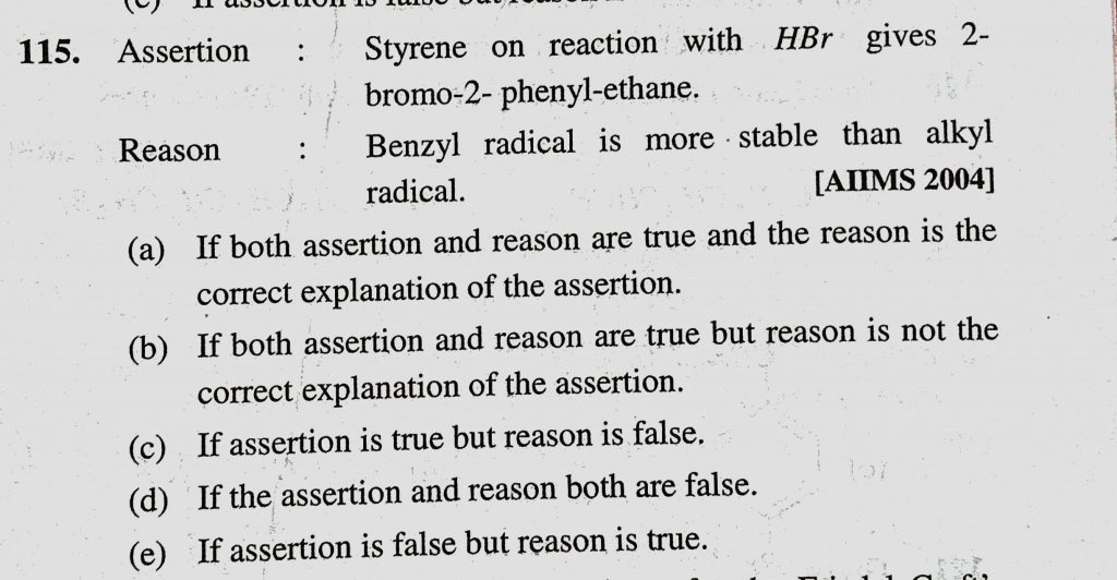 Assertion : Styrene on reaction with HBr gives 2-bromo-2-phenyl-ethane. Reason : Benzyl radical is more stable than alkyl radical. Assertion : Styrene on reaction with HBr gives 2-bromo-2-phenyl-ethane. Reason : Benzyl radical is more stable than alkyl radical. December 15, 2020 Category: Uncategorised (JEE Advanced Physics by BM Sharma + GMP Solutions) , Facebook Messenger WhatsApp Share this:TwitterFacebook Related