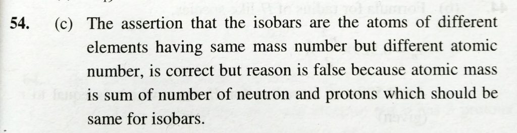 Assertion : The atoms of different elements having same mass number but different atomic number are known as isobars. Reason : The sum of protons and neutrons , in the isobars is always different . Assertion : The atoms of different elements having same mass number but different atomic number are known as isobars. Reason : The sum of protons and neutrons in the isobars is always different . November 26, 2020 Category: Uncategorised (JEE Advanced Physics by BM Sharma + GMP Solutions) , Facebook Messenger WhatsApp Share this:TwitterFacebook Related