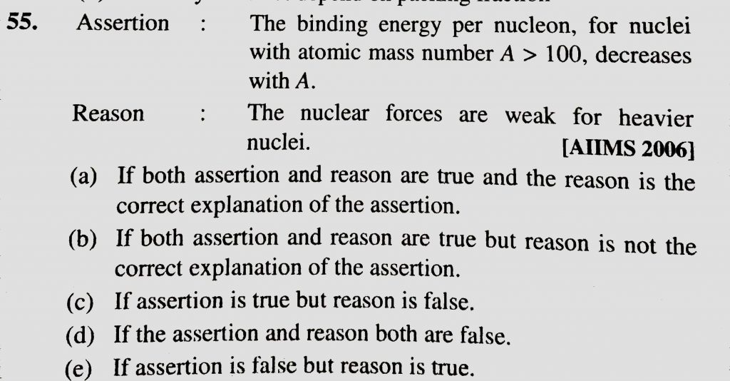 Assertion : The binding energy per nucleon , for nuclei with atomic mass number A >100 , decreases with A . Reason : The nuclear forces are weak for heavier nuclei. Assertion : The binding energy per nucleon decreases with A . Reason : The nuclear forces are weak for heavier nuclei. for nuclei with atomic mass number A >100 February 13, 2021 Category: Uncategorised (JEE Advanced Physics by BM Sharma + GMP Solutions) , Facebook Messenger WhatsApp Share this:TwitterFacebook Related