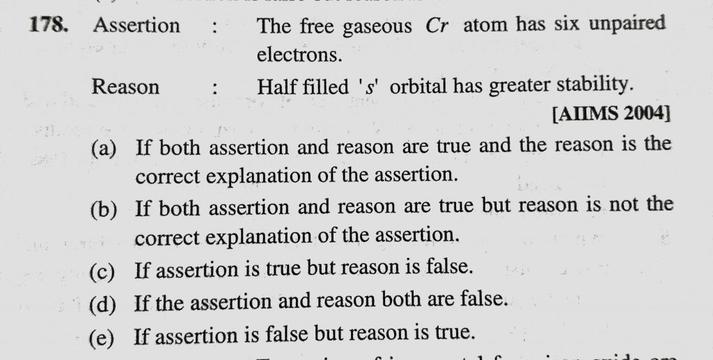 Assertion : The free gaseous Cr atom has six unpaired electrons. Reason : Half filled ‘s’ orbital has greater stability. Assertion : The free gaseous Cr atom has six unpaired electrons. Reason : Half filled 's' orbital has greater stability. November 30, 2020 Category: Uncategorised (JEE Advanced Physics by BM Sharma + GMP Solutions) , Facebook Messenger WhatsApp Share this:TwitterFacebook Related