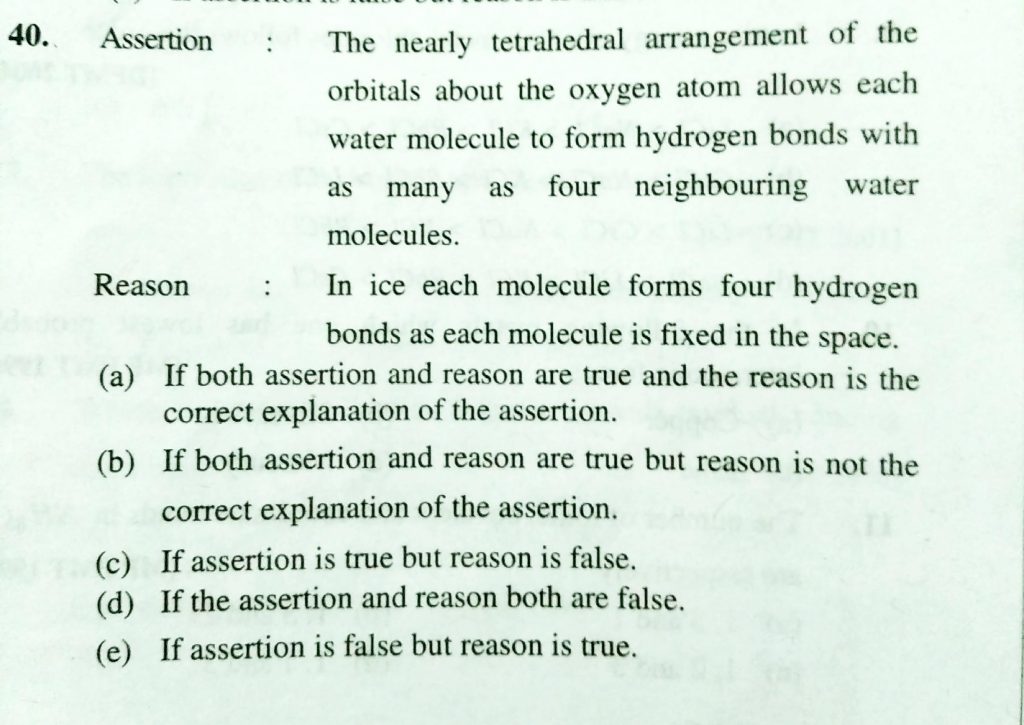 Assertion : The nearly tetrahedral arrangement of the orbitals about the oxygen atom allows each water molecules to form hydrogen bonds with as many as four neighbouring water molecules. Reason: In ice each molecule forms four hydrogen bonds as each molecule is fixed in the space.