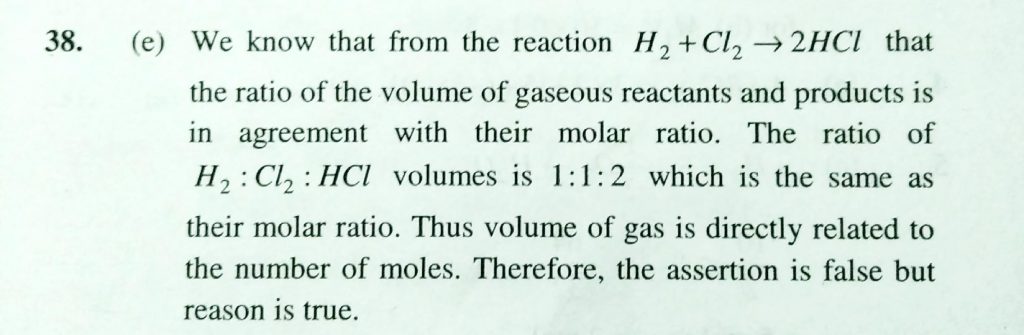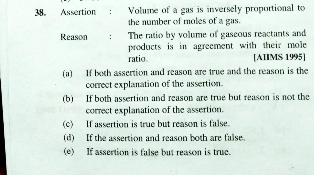 Assertion : Volume of a gas is inversely proportional to the number of moles of a gas. Reason : The ratio by volume of gaseous reactants and products is in agreement with their mole ratio. Assertion : Volume of a gas is inversely proportional to the number of moles of a gas. Reason : The ratio by volume of gaseous reactants and products is in agreement with their mole ratio. November 22, 2020 Category: Uncategorised (JEE Advanced Physics by BM Sharma + GMP Solutions) , Facebook Messenger WhatsApp Share this:TwitterFacebook Related