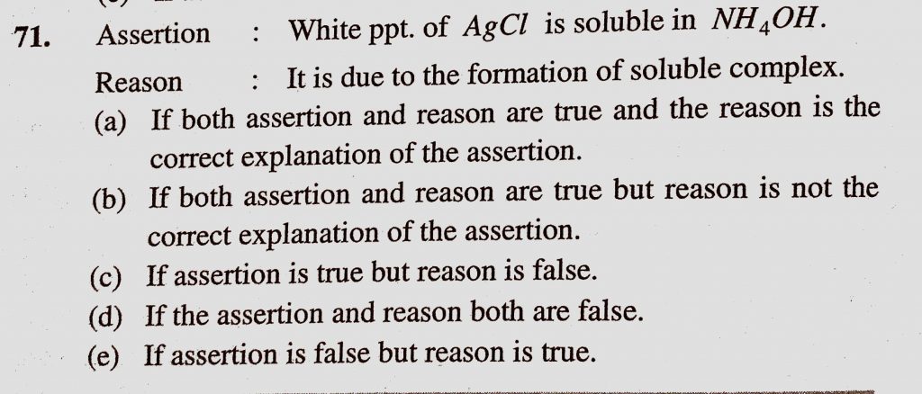 Assertion : White ppt. of AgCl is soluble in NH4OH. Reason : It is due to the formation of soluble complex. Assertion : White ppt. of AgCl is soluble in NH4OH. Reason : It is due to the formation of soluble complex. December 7, 2020 Category: Uncategorised (JEE Advanced Physics by BM Sharma + GMP Solutions) , Facebook Messenger WhatsApp Share this:TwitterFacebook Related