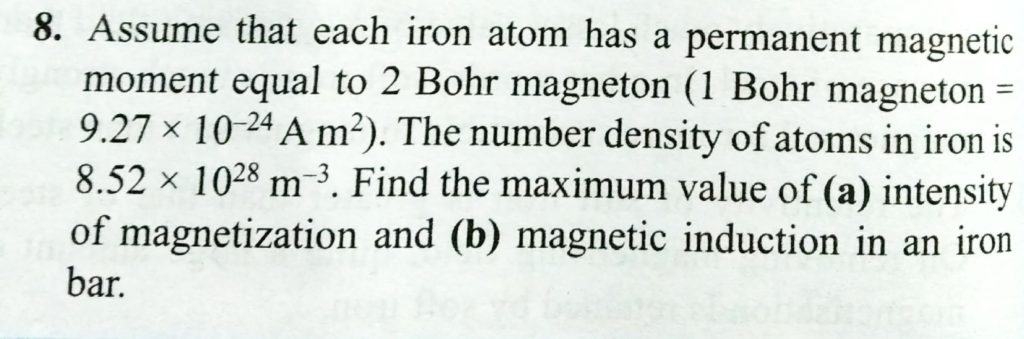 Assume that each iron atom has a permanent magnetic moment equal to 2 Bohr magnets (1 Bohr mag ≠ nequals 9.27 × 10^−24 Am^2). The density of atoms in iron is 8.52 × 10^2 8a msm^−3. (a) Find the maximum magnetization I in a long cylinder of iron. (b) Find the maximum magnetic field B on the axis inside the cylinder.