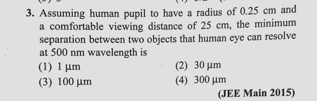 Assuming human pupil to have a radius of 0.25 cm and a comfortable viewing distance of 25 cm, the minimum separation between two objects that human eye can resolve at 500 Assuming human pupil to have a radius of 0.25 cm and a comfortable viewing distance of 25 cm the minimum separation between two objects that human eye can resolve at 500 October 12, 2020 Category: Uncategorised (JEE Advanced Physics by BM Sharma + GMP Solutions) , Facebook Messenger WhatsApp Share this:TwitterFacebook Related