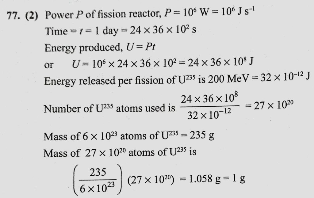 Assuming that about 200 MeV of energy is released per fission of 92U235 nuclei, the mass of U235 consumed per day in a fission reactor of power 1 megawatt will be approximately Assuming that about 200 MeV of energy is released per fission of 92U235 nuclei the mass of U235 consumed per day in a fission reactor of power 1 megawatt will be approximately October 18, 2020 Category: Uncategorised (JEE Advanced Physics by BM Sharma + GMP Solutions) , Facebook Messenger WhatsApp Share this:TwitterFacebook Related
