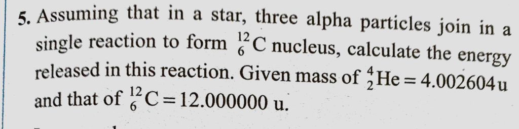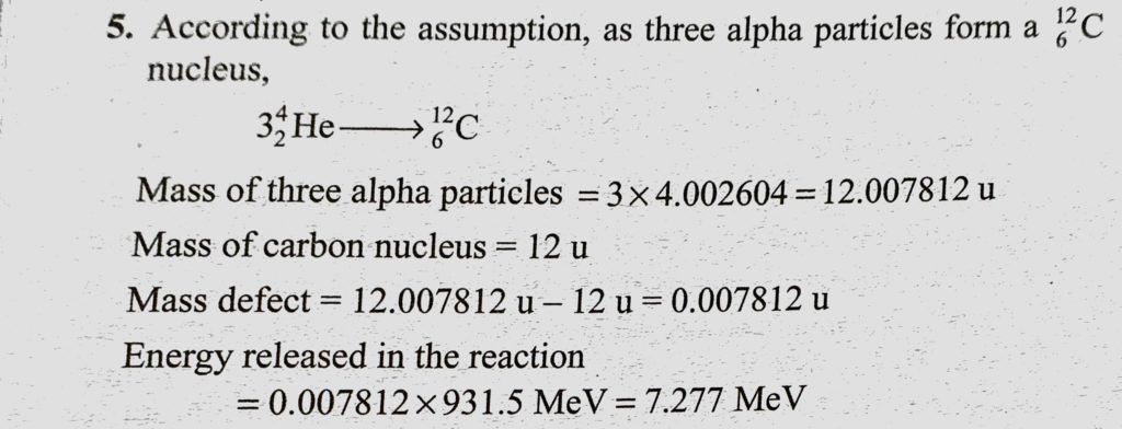 Assuming that in a star, three alpha particles join in a single reaction to form 12C6 nucleus, calculate the energy released in this reaction. Given mass of 4He2 = 4.002604 u and that of 12C6 = 12.000000 u. Assuming that in a star calculate the energy released in this reaction. Given mass of 4He2 = 4.002604 u and that of 12C6 = 12.000000 u. three alpha particles join in a single reaction to form 12C6 nucleus October 17, 2020 Category: Uncategorised (JEE Advanced Physics by BM Sharma + GMP Solutions) , Facebook Messenger WhatsApp Share this:TwitterFacebook Related