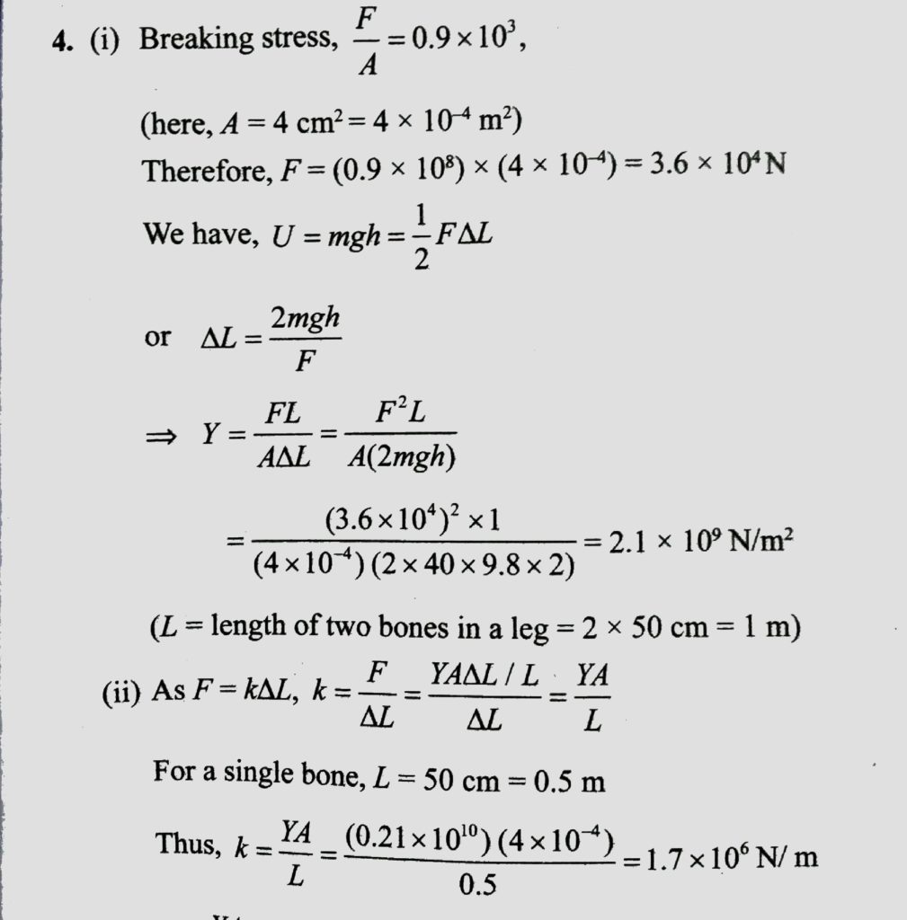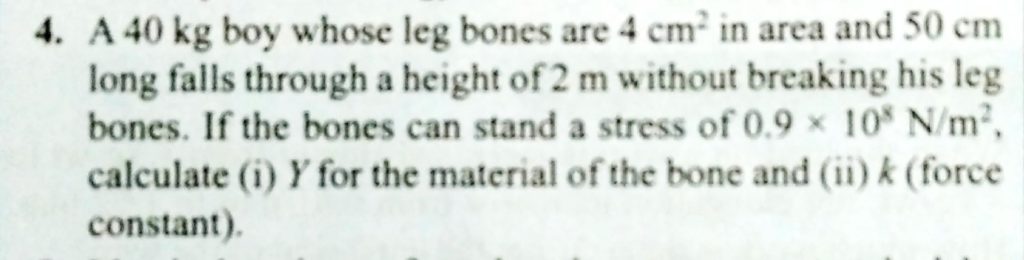 A 40 kg boy whose leg bones are 4 cm² in area and 50 cm long falls through a height of 50cm without breaking his leg bones. If the bones can stand a stress of 0.9 X 10^8 N/m². Calculate Young’s Modulus for the material of the bone. Assuming young's modulus of aluminum to be 7 x 10^10 N/m^2 find energy stored in an aluminium rod of cross section 10^-4 m^2 and 0.1 m long when compressed by a load of 10 kg. October 9, 2020 Category: Uncategorised (JEE Advanced Physics by BM Sharma + GMP Solutions) , Facebook Messenger WhatsApp Share this:TwitterFacebook Related