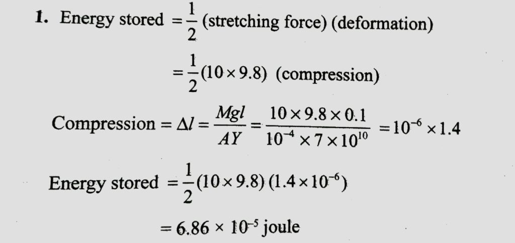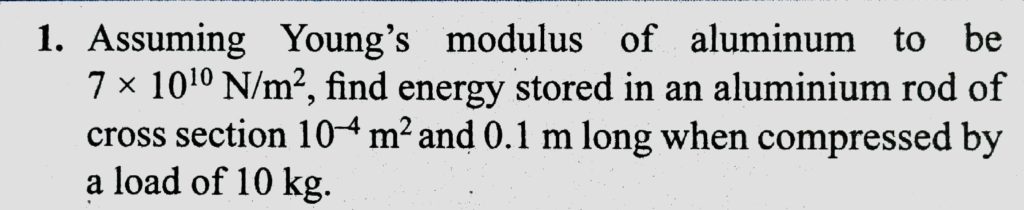 Assuming young’s modulus of aluminum to be 7 x 10^10 N/m^2, find energy stored in an aluminium rod of cross section 10^-4 m^2 and 0.1 m long when compressed by a load of 10 kg. Assuming young's modulus of aluminum to be 7 x 10^10 N/m^2 find energy stored in an aluminium rod of cross section 10^-4 m^2 and 0.1 m long when compressed by a load of 10 kg. October 9, 2020 Category: Uncategorised (JEE Advanced Physics by BM Sharma + GMP Solutions) , Facebook Messenger WhatsApp Share this:TwitterFacebook Related