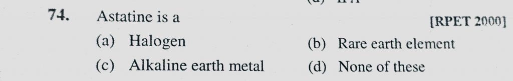 Astatine is a (a) Halogen (b) Rare earth element (c) Alkaline earth metal (d) None of these Astatine is a (a) Halogen (b) Rare earth element (c) Alkaline earth metal (d) None of these November 9, 2020 Category: Uncategorised (JEE Advanced Physics by BM Sharma + GMP Solutions) , Facebook Messenger WhatsApp Share this:TwitterFacebook Related