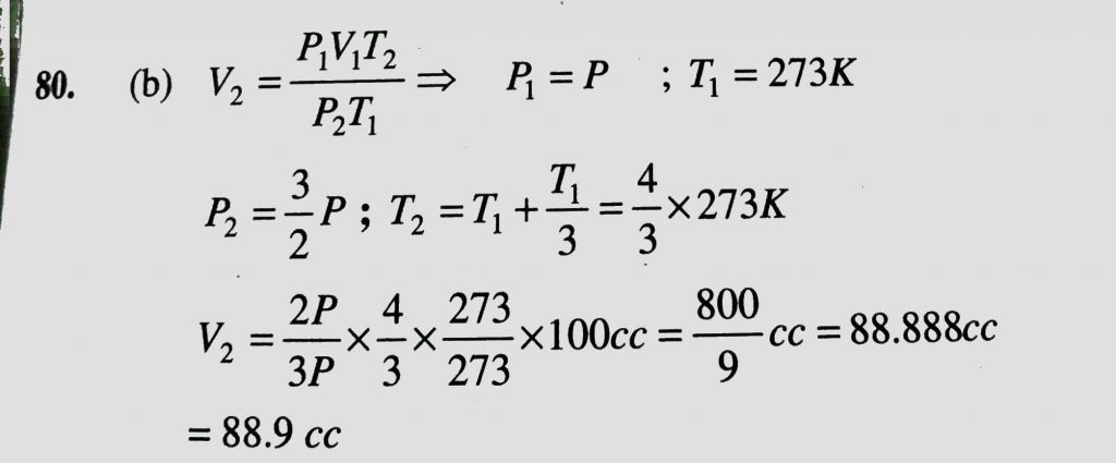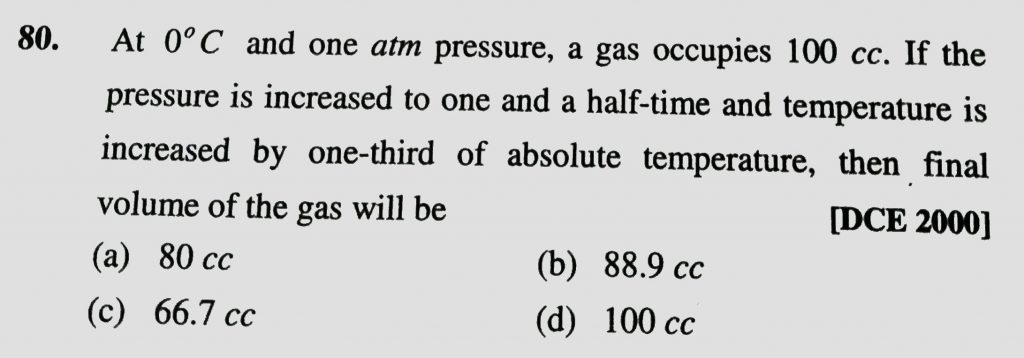 At 0 degree C and one atm pressure , a gas occupies 100 cc . If the pressure is increased to one end and a half – time and temperature is increased by one – third of absolute temperature , then final volume of the gas will be a gas occupies 100 cc . If the pressure is increased to one end and a half - time and temperature is increased by one - third of absolute temperature At 0 degree C and one atm pressure then final volume of the gas will be February 11, 2021 Category: Uncategorised (JEE Advanced Physics by BM Sharma + GMP Solutions) , Facebook Messenger WhatsApp Share this:TwitterFacebook Related