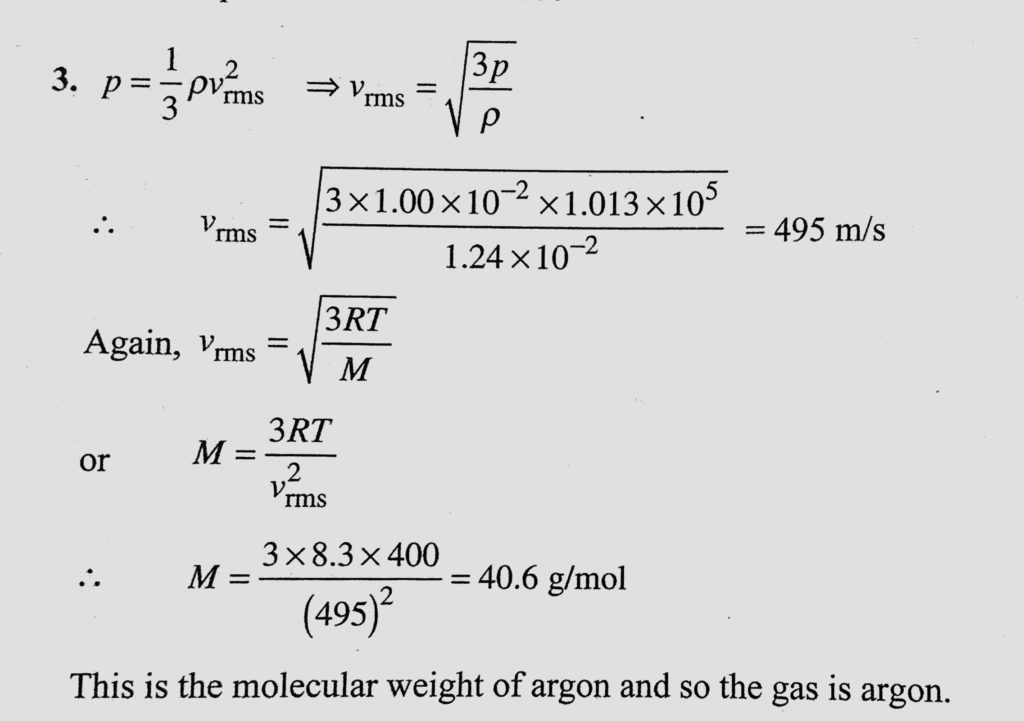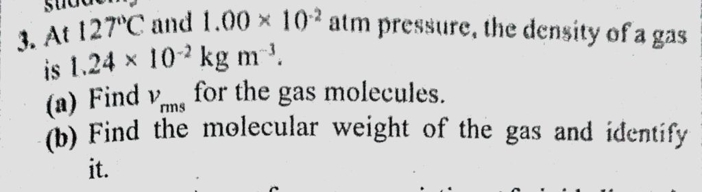 At 127 C and 1.00 * 10^-2 atm pressure, the density of a gas is 1.24 * 10^-2 kg m^-3. (a) Find Vrms for the gas molecules. (2) Find the molecular weight of the gas and identify it. At 127 C and 1.00 * 10^-2 atm pressure the density of a gas is 1.24 * 10^-2 kg m^-3. (a) Find Vrms for the gas molecules. (2) Find the molecular weight of the gas and identify it. October 27, 2020 Category: Uncategorised (JEE Advanced Physics by BM Sharma + GMP Solutions) , Facebook Messenger WhatsApp Share this:TwitterFacebook Related