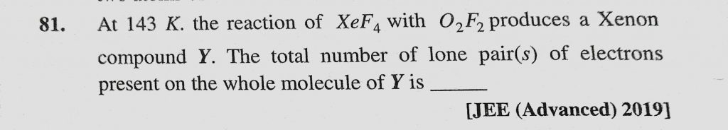 At 143 K. the reaction of XeF4 with O2F2 produces a Xenon compound Y. The total number of lone pair(s) of electrons present on the whole molecule of Y is ………….. At 143 K. the reaction of XeF4 with O2F2 produces a Xenon compound Y. The total number of lone pair(s) of electrons present on the whole molecule of Y is .............. November 29, 2020 Category: Uncategorised (JEE Advanced Physics by BM Sharma + GMP Solutions) , Facebook Messenger WhatsApp Share this:TwitterFacebook Related