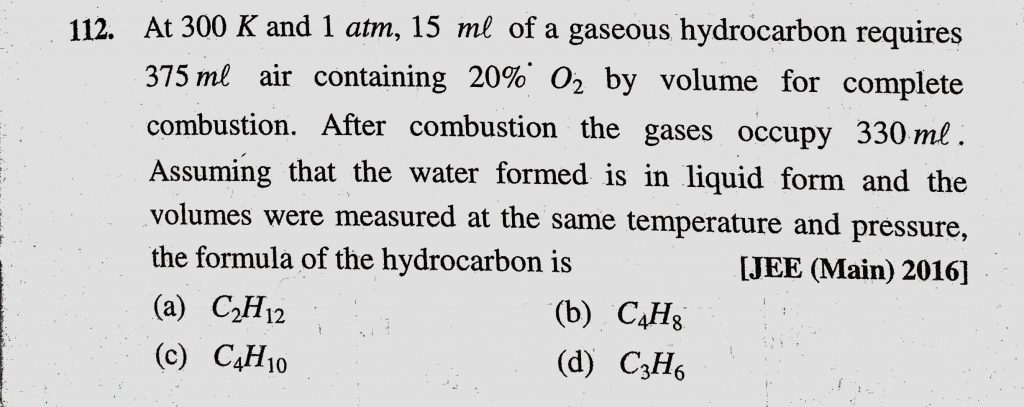 At 300 K and 1 atm, 15 ml of a gaseous hydrocarbon requires 375 ml air containing 20% O2 by volume for complete combustion. After combustion the gases occupy 330ml. Assuming that the water formed is in liquid form and the At 300 K and 1 atm The IUPAC name of C6H5COCl is (a) Benzoyl chloride (b) Benzene chloro ketone (c) Benzene carbonyl chloride (d) Chloro phenyl ketone December 11, 2020 Category: Uncategorised (JEE Advanced Physics by BM Sharma + GMP Solutions) , Facebook Messenger WhatsApp Share this:TwitterFacebook Related