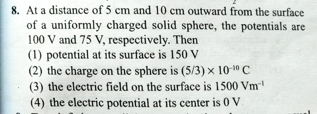 At a distance of 5 cm and 10 cm outward from the surface of a uniformly charged solid sphere, the potentials are 100 V and 75 V respectively. Then At a distance of 5 cm and 10 cm outward from the surface of a uniformly charged solid sphere the potentials are 100 V and 75 V respectively. Then November 6, 2020 Category: Uncategorised (JEE Advanced Physics by BM Sharma + GMP Solutions) , Facebook Messenger WhatsApp Share this:TwitterFacebook Related