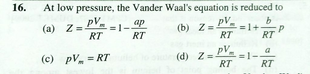 At low pressure , the Vander Waal’s equation is reduced to (a) Z = PVm /RT = 1 =ap/RT (b) Z = PVm/RT = 1 + b/RTp (c) PVm = RT (d) Z = PVm /RT = 1- a/RT At low pressure the Vander Waal's equation is reduced to (a) Z = PVm /RT = 1 =ap/RT (b) Z = PVm/RT = 1 + b/RTp (c) PVm = RT (d) Z = PVm /RT = 1- a/RT February 12, 2021 Category: Uncategorised (JEE Advanced Physics by BM Sharma + GMP Solutions) , Facebook Messenger WhatsApp Share this:TwitterFacebook Related