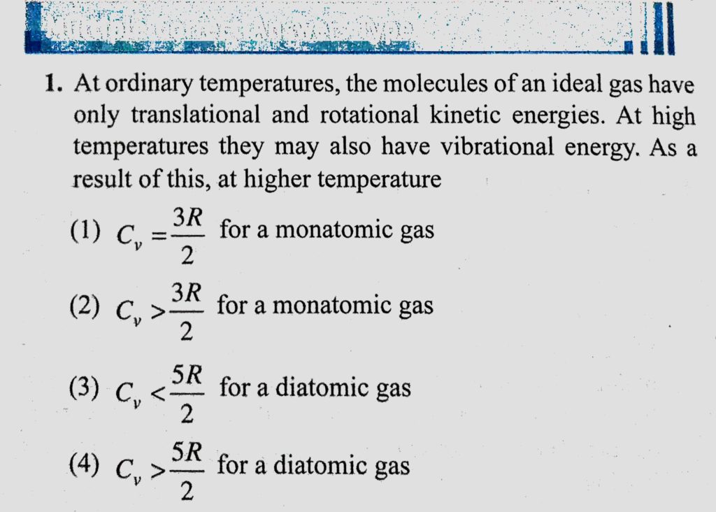 At ordinary temperatures, the molecules of an ideal gas have only translational and rotational kinetic energies. At high temperatures they may also have vibrational energy . As At ordinary temperatures the molecules of an ideal gas have only translational and rotational kinetic energies. At high temperatures they may also have vibrational energy . As October 29, 2020 Category: Uncategorised (JEE Advanced Physics by BM Sharma + GMP Solutions) , Facebook Messenger WhatsApp Share this:TwitterFacebook Related