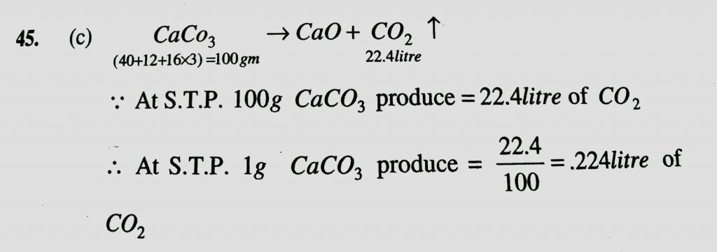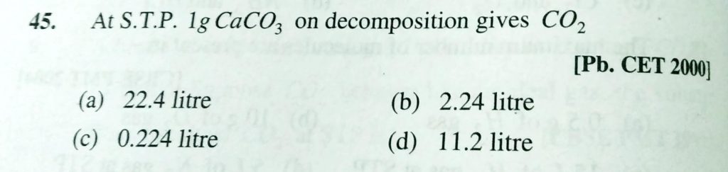 At S.T.P. 1 g CaCO3 on decomposition gives CO2 (a) 22.4 L (b) 2.24 L (c) 0.224 L (d0 11.2 L At S.T.P. 1 g CaCO3 on decomposition gives CO2 (a) 22.4 L (b) 2.24 L (c) 0.224 L (d0 11.2 L February 10, 2021 Category: Uncategorised (JEE Advanced Physics by BM Sharma + GMP Solutions) , Facebook Messenger WhatsApp Share this:TwitterFacebook Related