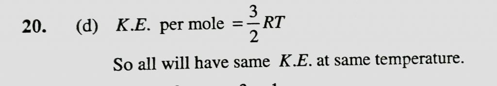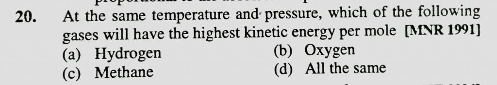 At the same temperature and pressure , which of the following gases will have the highest kinetic energy per mole (A) hydrogen (b) oxygen (c) methane (d) all of these At the same temperature and pressure which of the following gases will have the highest kinetic energy per mole (A) hydrogen (b) oxygen (c) methane (d) all of these February 11, 2021 Category: Uncategorised (JEE Advanced Physics by BM Sharma + GMP Solutions) , Facebook Messenger WhatsApp Share this:TwitterFacebook Related