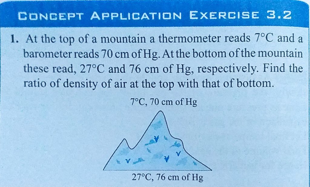 At the top of a mountain a thermometer reads 7 C and a barometer reads 70 cm of Hg. At the bottom of the mountain these read, 27 C and 76 cm of Hg, respectively. Find the ratio of 27 C and 76 cm of Hg At the top of a mountain a thermometer reads 7 C and a barometer reads 70 cm of Hg. At the bottom of the mountain these read respectively. Find the ratio of October 27, 2020 Category: Uncategorised (JEE Advanced Physics by BM Sharma + GMP Solutions) , Facebook Messenger WhatsApp Share this:TwitterFacebook Related