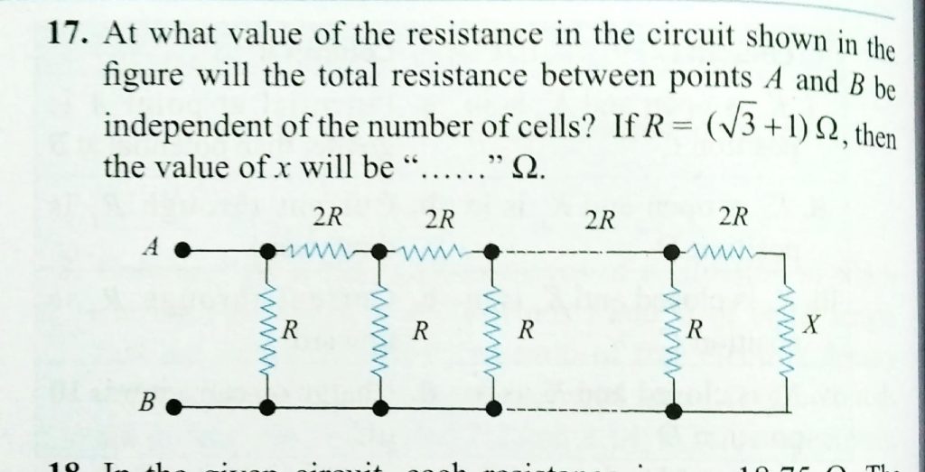 At what value of the resistance in the circuit shown in the figure will the total resistance between points A and B be independent of the number of cells? If R = ( root 3 +1)Ω, then the value of x will be ′′ ……”Ω. At what value of the resistance in the circuit shown in the figure will the total resistance between points A and B be independent of the number of cells? If R = ( root 3 +1)Ω then the value of x will be ′′ ……"Ω. November 12, 2020 Category: Uncategorised (JEE Advanced Physics by BM Sharma + GMP Solutions) , Facebook Messenger WhatsApp Share this:TwitterFacebook Related