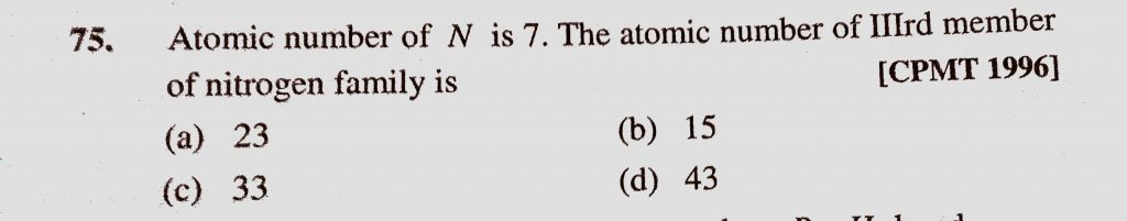 Atomic number of N is 7. The atomic number of IIIrd member of nitrogen family is (a) 23 (b) 15 (c) 33 (d) 43 Atomic number of N is 7. The atomic number of IIIrd member of nitrogen family is (a) 23 (b) 15 (c) 33 (d) 43 November 18, 2020 Category: Uncategorised (JEE Advanced Physics by BM Sharma + GMP Solutions) , Facebook Messenger WhatsApp Share this:TwitterFacebook Related
