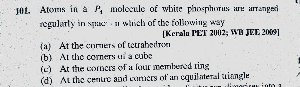 Atoms in a P4 molecule of white phosphorus are arranged regularly in space in which of the following way (a) At the corners of tetrahedron (b) At the corners of a cube Atoms in a P4 molecule of white phosphorus are arranged regularly in space in which of the following way (a) At the corners of tetrahedron (b) At the corners of a cube November 18, 2020 Category: Uncategorised (JEE Advanced Physics by BM Sharma + GMP Solutions) , Facebook Messenger WhatsApp Share this:TwitterFacebook Related