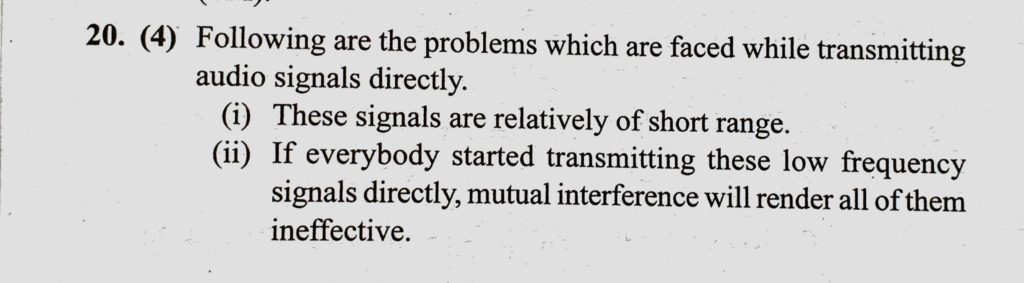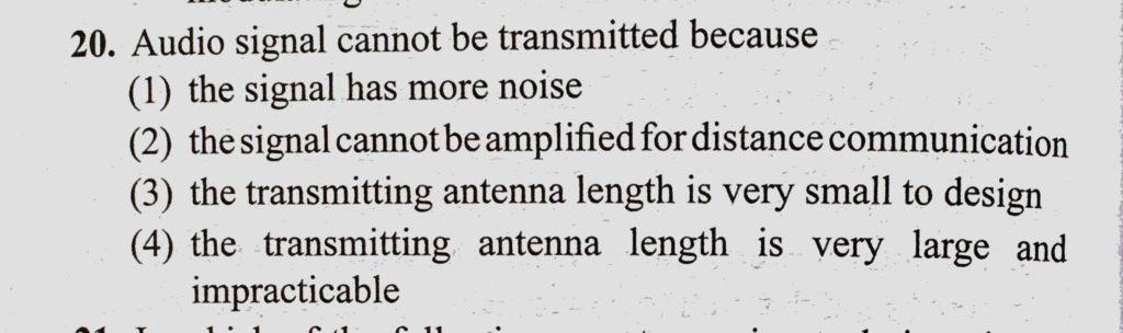 Audio signal cannot be transmitted because (1) the signal has more noise (2) the signal cannot be amplified for distance communication (3) the transmitting antenna length is very small to design Audio signal cannot be transmitted because (1) the signal has more noise (2) the signal cannot be amplified for distance communication (3) the transmitting antenna length is very small to design October 23, 2020 Category: Uncategorised (JEE Advanced Physics by BM Sharma + GMP Solutions) , Facebook Messenger WhatsApp Share this:TwitterFacebook Related