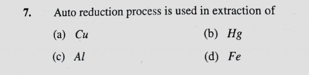 Auto reduction process is used in extraction of (a) Cu (b) Hg (c) Al (d) Fe Auto reduction process is used in extraction of (a) Cu (b) Hg (c) Al (d) Fe November 12, 2020 Category: Uncategorised (JEE Advanced Physics by BM Sharma + GMP Solutions) , Facebook Messenger WhatsApp Share this:TwitterFacebook Related