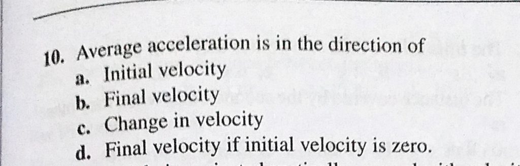 Average acceleration is in the direction of a. Initial velocity b. Final velocity c. Change in velocity d. Final velocity if initial Average acceleration is in the direction of a. Initial velocity b. Final velocity c. Change in velocity d. Final velocity if initial September 19, 2020 Category: Uncategorised (JEE Advanced Physics by BM Sharma + GMP Solutions) , Facebook Messenger WhatsApp Share this:TwitterFacebook Related