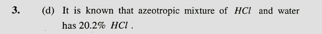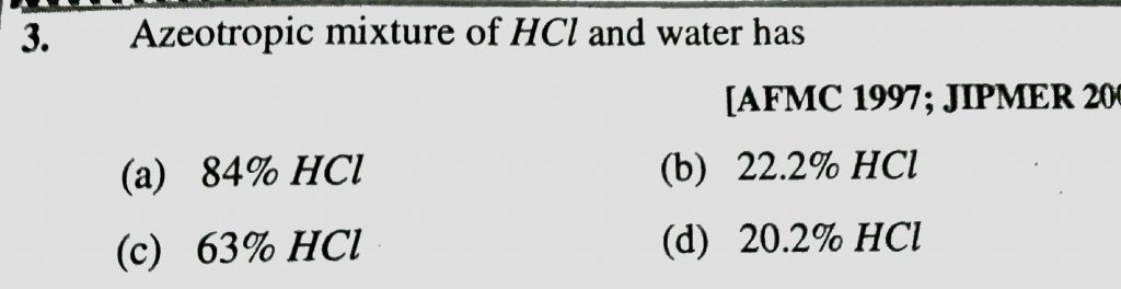 Azeotropic mixture of HCL and water has (a) 84% HCL (b) 22.2% HCL (C) 63% HCL (d) 20.2% HCL Azeotropic mixture of HCL and water has (a) 84% HCL (b) 22.2% HCL (C) 63% HCL (d) 20.2% HCL December 14, 2020 Category: Uncategorised (JEE Advanced Physics by BM Sharma + GMP Solutions) , Facebook Messenger WhatsApp Share this:TwitterFacebook Related