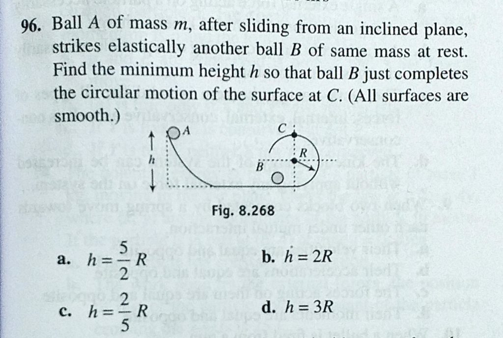 Ball A of mass m, after sliding from an inclined plane, strikes elastically another ball B of same mass at rest. Find the minimum height h so that ball B just completes the circular motion of the after sliding from an inclined plane Ball A of mass m strikes elastically another ball B of same mass at rest. Find the minimum height h so that ball B just completes the circular motion of the October 4, 2020 Category: Uncategorised (JEE Advanced Physics by BM Sharma + GMP Solutions) , Facebook Messenger WhatsApp Share this:TwitterFacebook Related