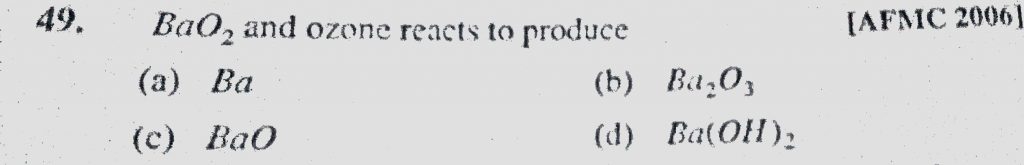 BaO2 and ozone reacts to produce (a) Ba (b) Ba2O3 (c) BaO (d) Ba(OH)2 BaO2 and ozone reacts to produce (a) Ba (b) Ba2O3 (c) BaO (d) Ba(OH)2 November 15, 2020 Category: Uncategorised (JEE Advanced Physics by BM Sharma + GMP Solutions) , Facebook Messenger WhatsApp Share this:TwitterFacebook Related