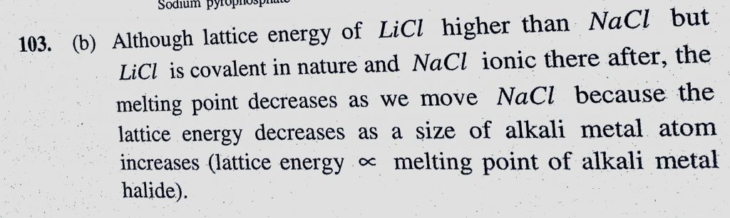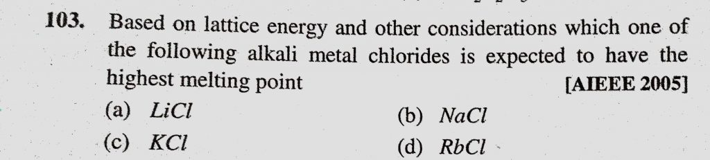 Based on lattice energy and other considerations which one of the following alkali metal chlorides is expected to have the highest melting point (a) LiCl Based on lattice energy and other considerations which one of the following alkali metal chlorides is expected to have the highest melting point (a) LiCl November 15, 2020 Category: Uncategorised (JEE Advanced Physics by BM Sharma + GMP Solutions) , Facebook Messenger WhatsApp Share this:TwitterFacebook Related