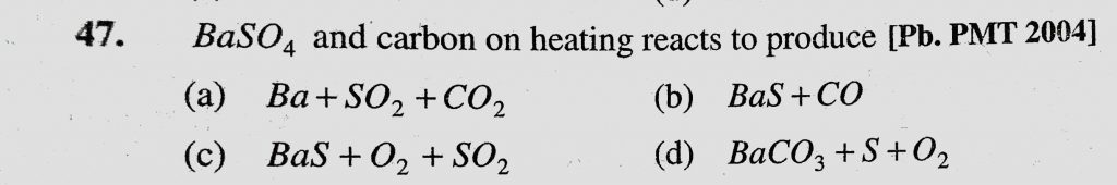 BaSO4 and carbon on heating reacts to produce (a) Ba + SO2 + CO2 (b) BaS + CO (c) BaS + O2 + SO2 BaSO4 and carbon on heating reacts to produce (a) Ba + SO2 + CO2 (b) BaS + CO (c) BaS + O2 + SO2 November 27, 2020 Category: Uncategorised (JEE Advanced Physics by BM Sharma + GMP Solutions) , Facebook Messenger WhatsApp Share this:TwitterFacebook Related