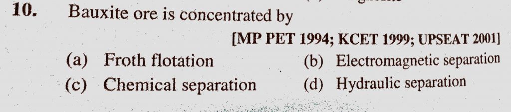 Bauxite ore is concentrated by (a) Froth flotation (b) Electromagnetic separation (c) Chemical separation (d) Hydraulic separation Bauxite ore is concentrated by (a) Froth flotation (b) Electromagnetic separation (c) Chemical separation (d) Hydraulic separation November 11, 2020 Category: Uncategorised (JEE Advanced Physics by BM Sharma + GMP Solutions) , Facebook Messenger WhatsApp Share this:TwitterFacebook Related