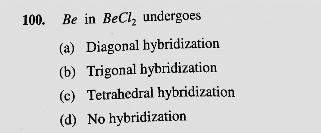 Be in BeCL2 undergoes (a) Diagonal hybridization (b) Trigonal hybridization (c) Tetrahedral hybridization (d0 No hybridization Be in BeCL2 undergoes (a) Diagonal hybridization (b) Trigonal hybridization (c) Tetrahedral hybridization (d0 No hybridization December 6, 2020 Category: Uncategorised (JEE Advanced Physics by BM Sharma + GMP Solutions) , Facebook Messenger WhatsApp Share this:TwitterFacebook Related