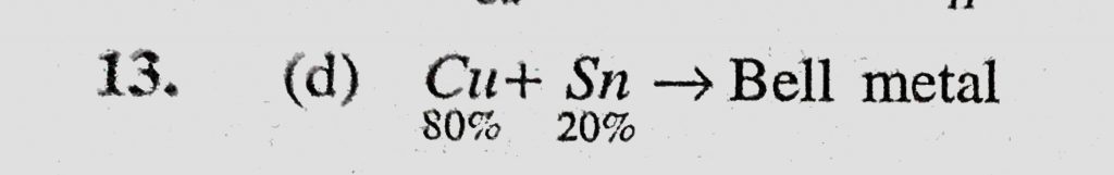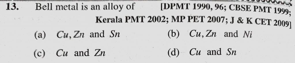 Bell metal is an alloy of (a) Cu, Zn and Sn (b) Cu, Zn and Ni (c) Cu and Zn (d) Cu and Sn Bell metal is an alloy of (a) Cu Zn and Ni (c) Cu and Zn (d) Cu and Sn Zn and Sn (b) Cu December 1, 2020 Category: Uncategorised (JEE Advanced Physics by BM Sharma + GMP Solutions) , Facebook Messenger WhatsApp Share this:TwitterFacebook Related