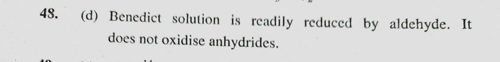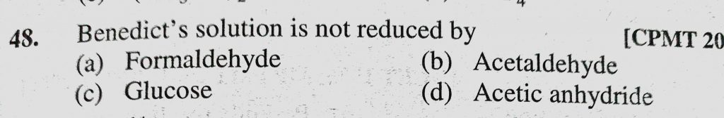 Benedict’s solution is not reduced by (a) Formaldehyde (b) Acetaldehyde (c) Glucose (d) Acetic anhydride Benedict's solution is not reduced by (a) Formaldehyde (b) Acetaldehyde (c) Glucose (d) Acetic anhydride February 13, 2021 Category: Uncategorised (JEE Advanced Physics by BM Sharma + GMP Solutions) , Facebook Messenger WhatsApp Share this:TwitterFacebook Related