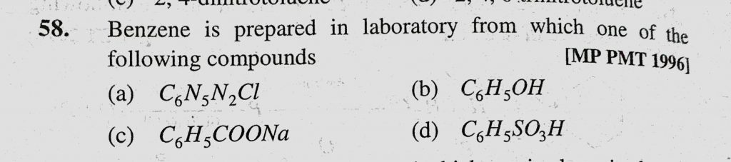 Benzene is prepared in laboratory from which one of the following compounds (a) C6H5N2Cl (b) C6H5OH (c) C6H5COONa (d) C6H5SO3H Benzene is prepared in laboratory from which one of the following compounds (a) C6H5N2Cl (b) C6H5OH (c) C6H5COONa (d) C6H5SO3H December 15, 2020 Category: Uncategorised (JEE Advanced Physics by BM Sharma + GMP Solutions) , Facebook Messenger WhatsApp Share this:TwitterFacebook Related