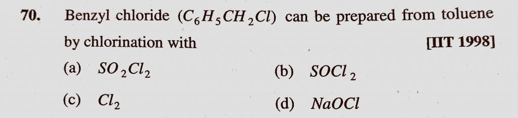 Benzyl chloride (C6H5CH2Cl) can be prepared from toluene by chlorination with (a) SO2Cl2 (b) SOCl2 (c) Cl2 (d) NaOCl Benzyl chloride (C6H5CH2Cl) can be prepared from toluene by chlorination with (a) SO2Cl2 (b) SOCl2 (c) Cl2 (d) NaOCl December 16, 2020 Category: Uncategorised (JEE Advanced Physics by BM Sharma + GMP Solutions) , Facebook Messenger WhatsApp Share this:TwitterFacebook Related