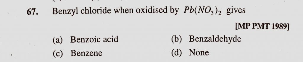 Benzyl chloride when oxidised by Pb(NO3)2 gives (a) Benzoic acid (b) Benzaldehyde (c) Benzene (d) None Benzyl chloride when oxidised by Pb(NO3)2 gives (a) Benzoic acid (b) Benzaldehyde (c) Benzene (d) None February 8, 2021 Category: Uncategorised (JEE Advanced Physics by BM Sharma + GMP Solutions) , Facebook Messenger WhatsApp Share this:TwitterFacebook Related