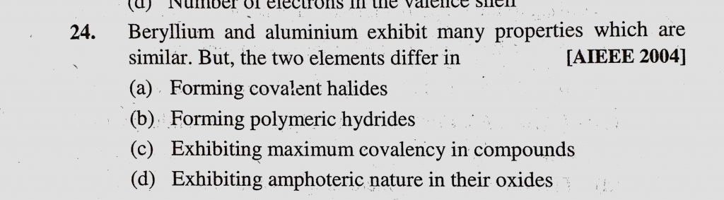 Beryllium and aluminium exhibit many properties which are similar. But, the two elements differ in (a) Forming covalent halides (b) Forming polymeric hydrides Beryllium and aluminium exhibit many properties which are similar. But the two elements differ in (a) Forming covalent halides (b) Forming polymeric hydrides November 10, 2020 Category: Uncategorised (JEE Advanced Physics by BM Sharma + GMP Solutions) , Facebook Messenger WhatsApp Share this:TwitterFacebook Related