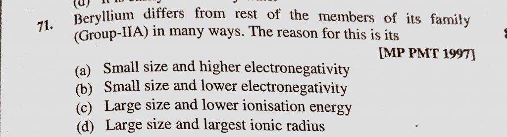 Beryllium differs from rest of the members of its family (Group – IIA) in many ways. The reason for this is its (a) Small size and higher electronegativity Beryllium differs from rest of the members of its family (Group - IIA) in many ways. The reason for this is its (a) Small size and higher electronegativity November 15, 2020 Category: Uncategorised (JEE Advanced Physics by BM Sharma + GMP Solutions) , Facebook Messenger WhatsApp Share this:TwitterFacebook Related