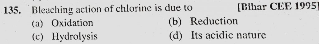 Bleaching action of chlorine is due to (a) Oxidation (b) Reduction (c) Hydrolysis (d) Its acidic nature Bleaching action of chlorine is due to (a) Oxidation (b) Reduction (c) Hydrolysis (d) Its acidic nature November 24, 2020 Category: Uncategorised (JEE Advanced Physics by BM Sharma + GMP Solutions) , Facebook Messenger WhatsApp Share this:TwitterFacebook Related