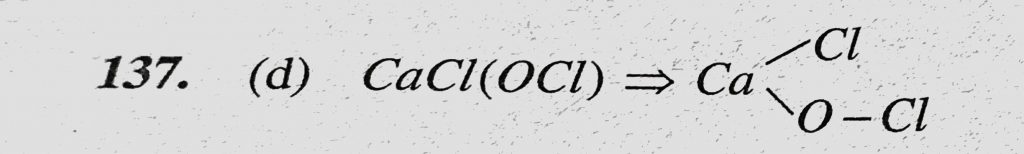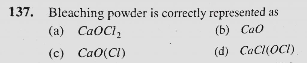 Bleaching powder is correctly represented as (a) CaOCl2 (b) CaO (c) CaO(Cl) (d) CaCl(OCl) Bleaching powder is correctly represented as (a) CaOCl2 (b) CaO (c) CaO(Cl) (d) CaCl(OCl) November 24, 2020 Category: Uncategorised (JEE Advanced Physics by BM Sharma + GMP Solutions) , Facebook Messenger WhatsApp Share this:TwitterFacebook Related