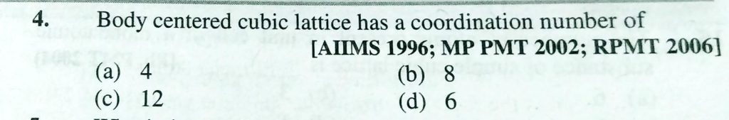 Body centred cubic lattice has a coordination number of (a) 4 (b) 8 (c) 12 (d) 6 Body centred cubic lattice has a coordination number of (a) 4 (b) 8 (c) 12 (d) 6 December 17, 2020 Category: Uncategorised (JEE Advanced Physics by BM Sharma + GMP Solutions) , Facebook Messenger WhatsApp Share this:TwitterFacebook Related