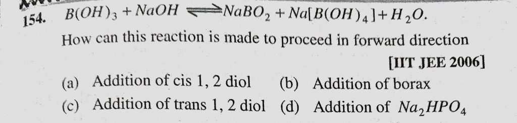 B(OH)3 + NaOH to NaBO2 + Na(B (OH)4) + H2O. How can this reaction is made to proceed in forward direction (a) Addition of cis 1, 2 diol 2 diol B(OH)3 + NaOH to NaBO2 + Na(B (OH)4) + H2O. How can this reaction is made to proceed in forward direction (a) Addition of cis 1 November 28, 2020 Category: Uncategorised (JEE Advanced Physics by BM Sharma + GMP Solutions) , Facebook Messenger WhatsApp Share this:TwitterFacebook Related