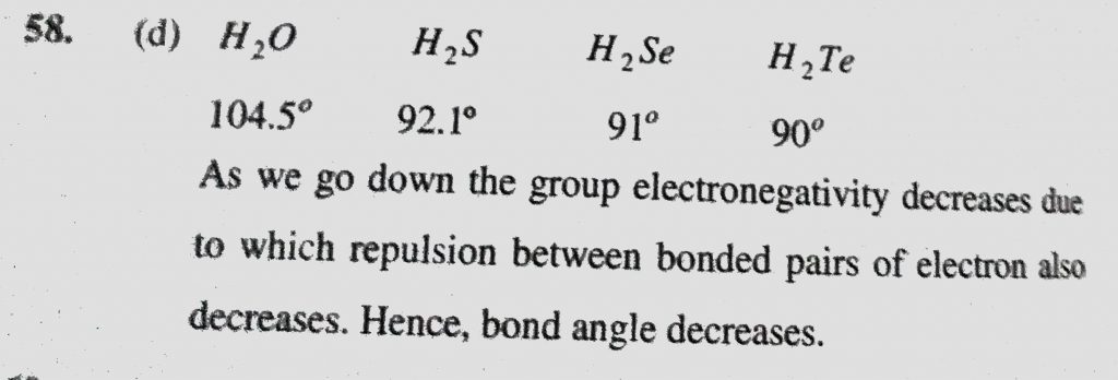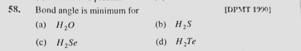 Bond angle is minimum for (a) H2O (b) H2S (c) H2Se (d) H2Te Bond angle is minimum for (a) H2O (b) H2S (c) H2Se (d) H2Te November 23, 2020 Category: Uncategorised (JEE Advanced Physics by BM Sharma + GMP Solutions) , Facebook Messenger WhatsApp Share this:TwitterFacebook Related